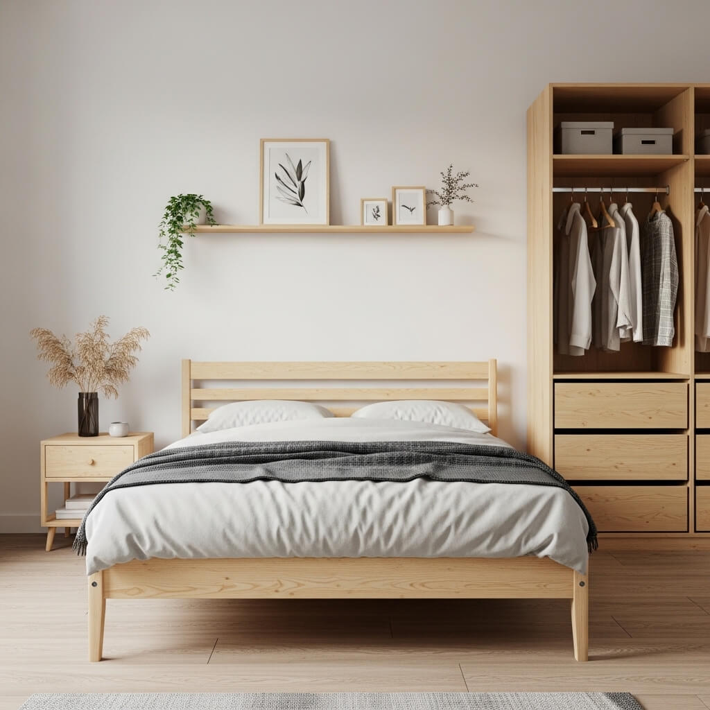 - Pinterest Styling Tip: Keep your wood tones cohesive. If your bed frame is a pale ash, ensure your floating shelves, picture frames, and open wardrobe share a similar warm, light-wood tone. This consistency calms the eye and unifies the tiny bedroom.