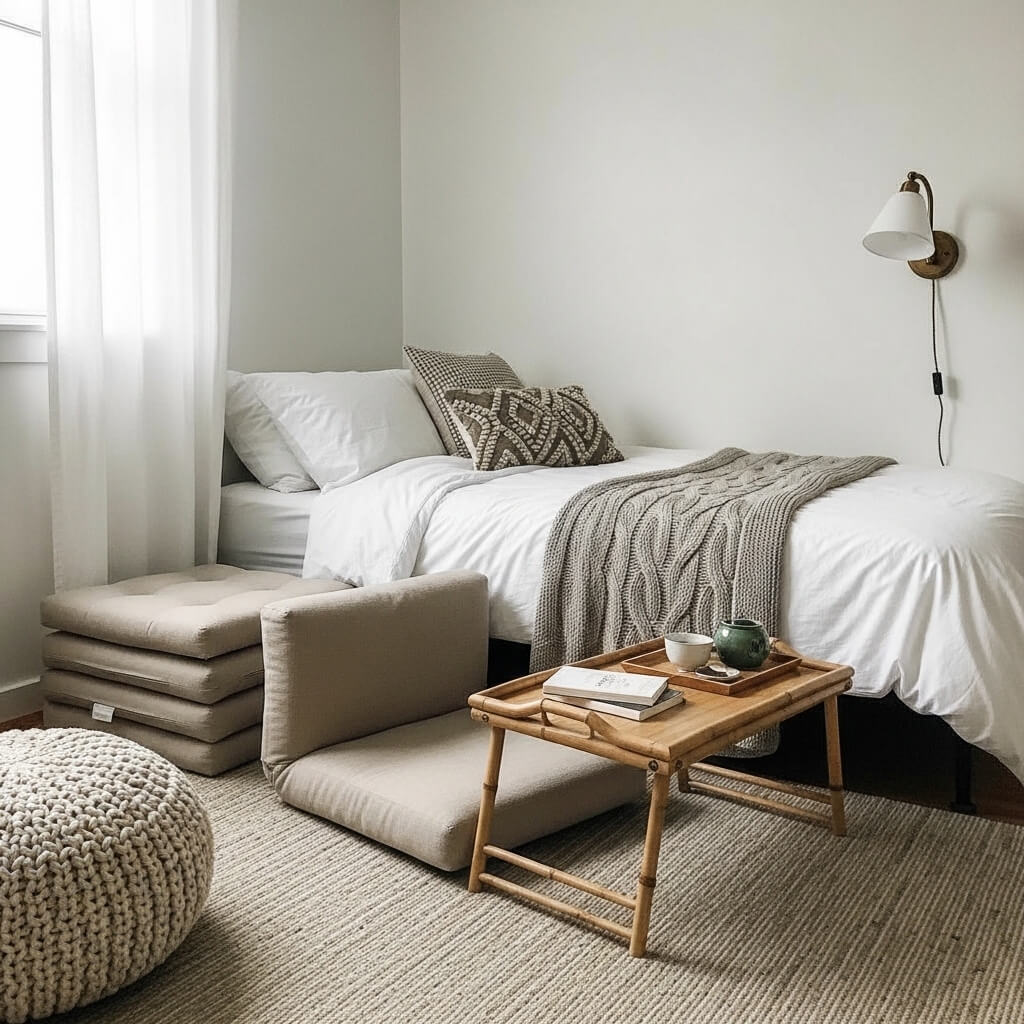- Why it saves space: Floor cushions (zabuton) or legless chairs (zaisu) can be stacked in a corner or slid under the bed when you need floor space for yoga or rolling out a yoga mat. They offer comfortable seating without obstructing sightlines across the room.