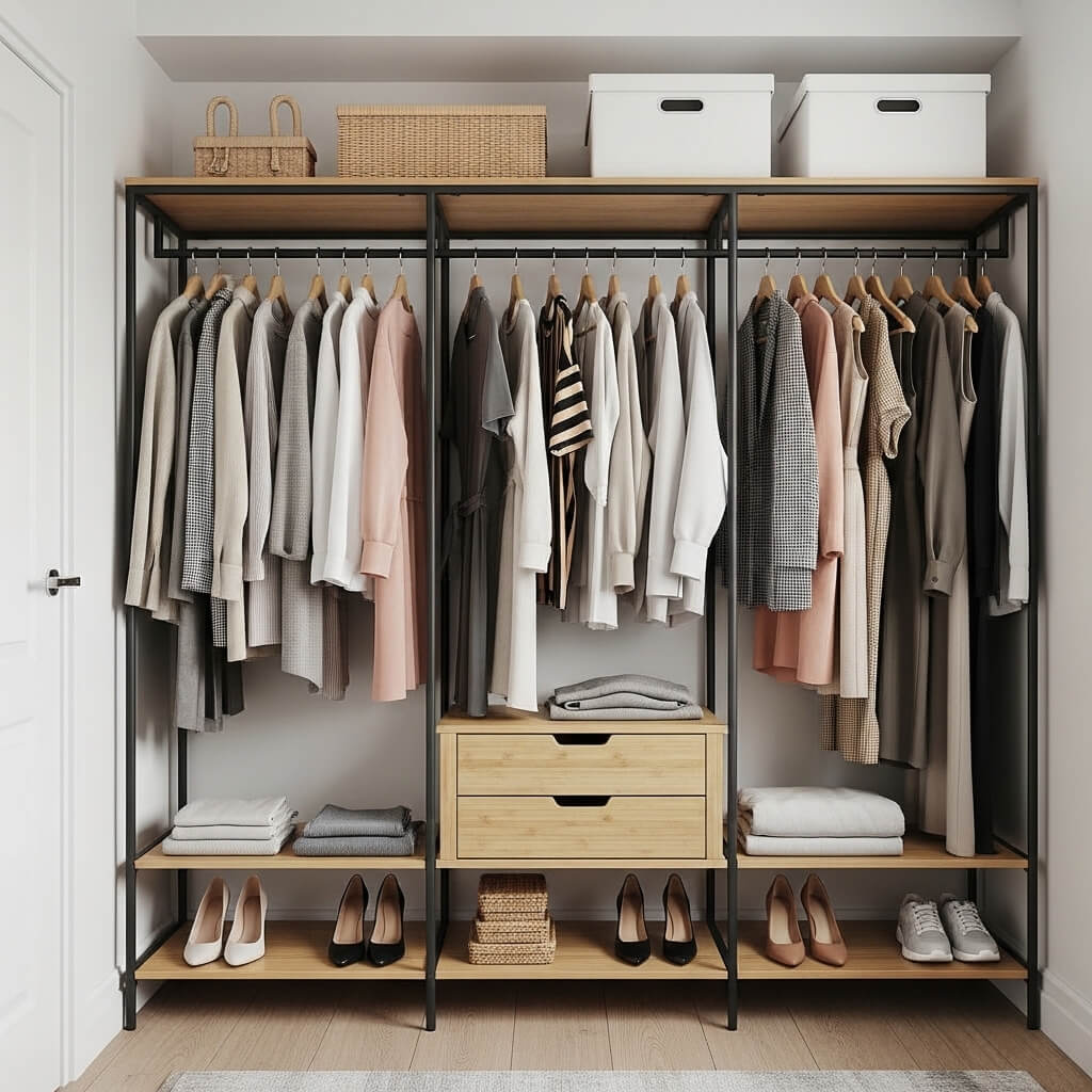 - Why it saves space: A bamboo or matte black metal rack takes up less space than bulky furniture. Since it’s open, you can see the walls and floor, which keeps the room feeling spacious.