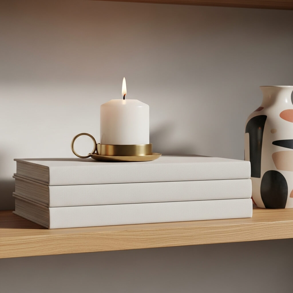 - Stack large hardcover books horizontally to create varying heights.