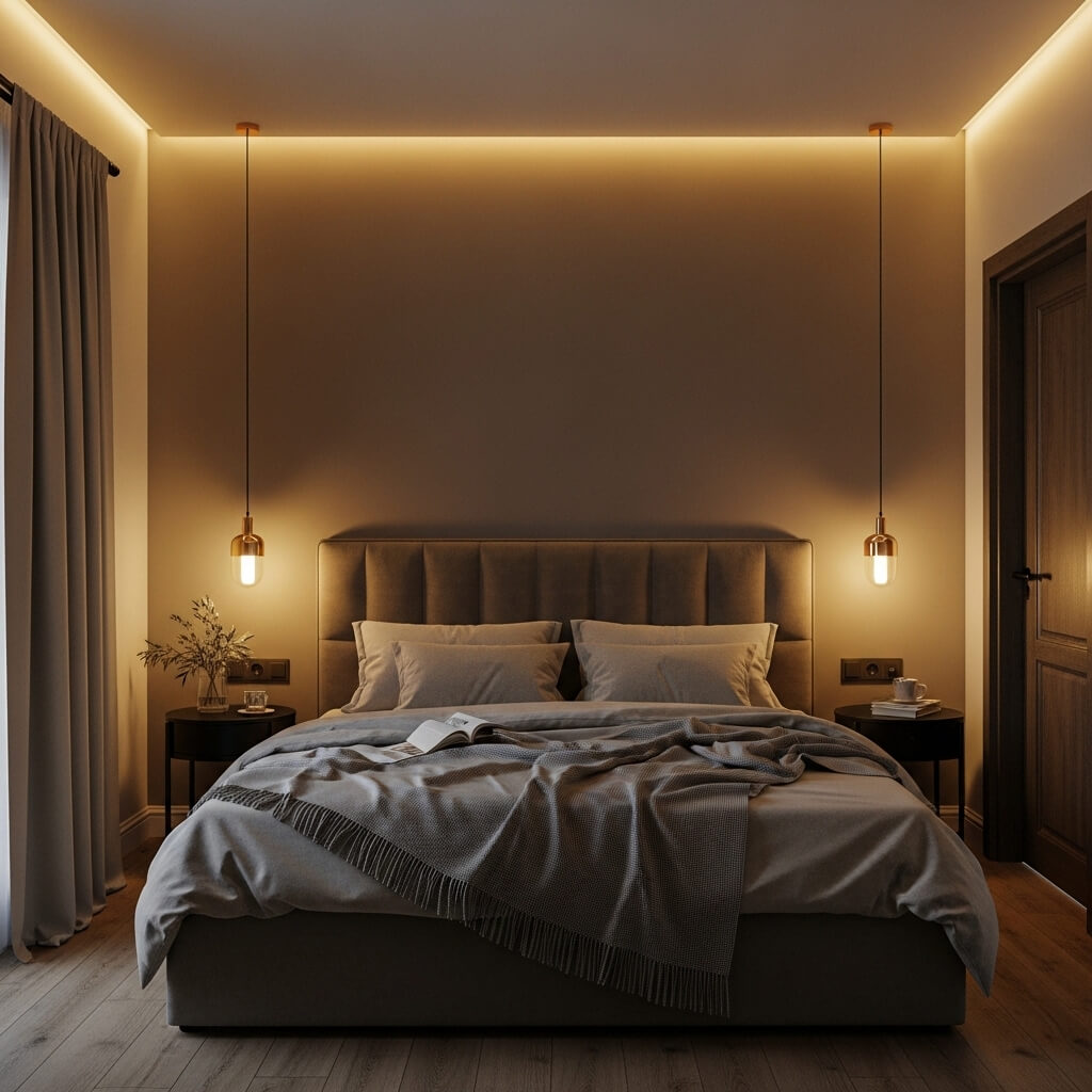 - String hidden LED strips behind your headboard for aesthetic depth.