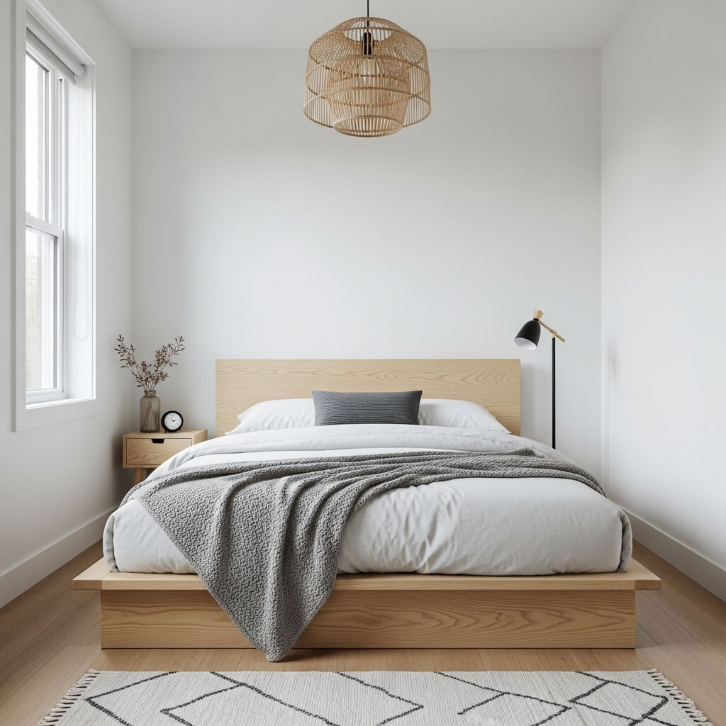 - The Minimalist Base: Choose a simple, low-profile wooden platform bed without a footboard. Light woods like ash, birch, or white oak keep the look airy.