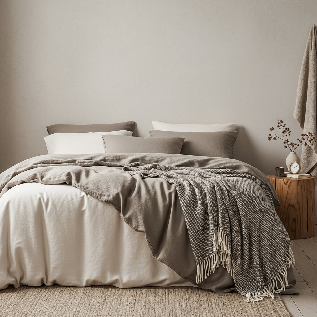 - The Cozy Layering: Start with cream sheets, add a darker beige duvet, and finish with a textured throw blanket tossed casually across the foot. This “undone” look is relaxed and luxurious.