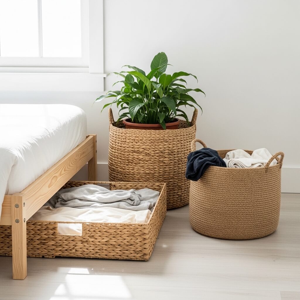 - The Minimalist Function: Slide flat baskets under the bed for off-season clothes, or use a structured rattan basket for laundry or plants. They hide clutter behind beautiful textures.