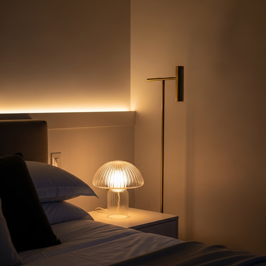 - The Fixtures: Incorporate trendy, sculptural light sources. A ribbed glass mushroom lamp on the nightstand, a warm-toned LED light strip hidden behind the headboard, or a minimalist brass floor lamp casting light against the wall. Always use warm white bulbs (2700K).