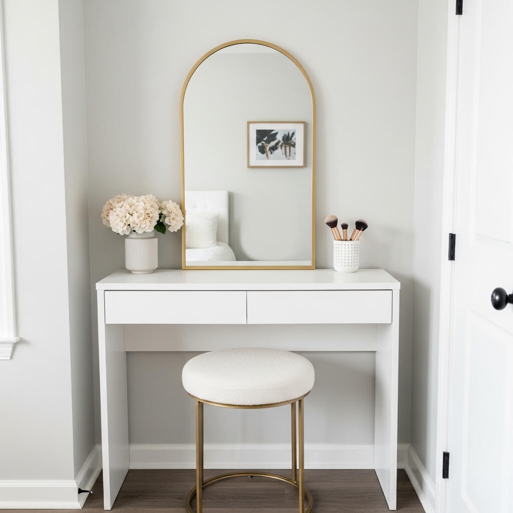 - The Accessories: Pair it with a frameless arched mirror, a bouclé vanity stool, and a small, aesthetic cup to hold your makeup brushes. Keep the surface immaculate. This creates the perfect backdrop for “Get Ready With Me” (GRWM) photos or videos.