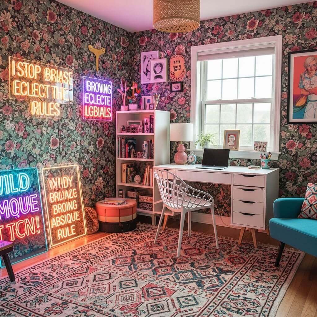 I mixed a wild boho rug with neon signs, and the result looks fantastic.