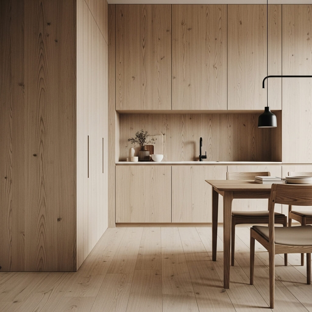 Avoid dark, heavy woods like mahogany or glossy cherry, which lean traditional. Instead, focus on light-reflecting, cozy woods: white oak, beech, ash, and pale walnut.