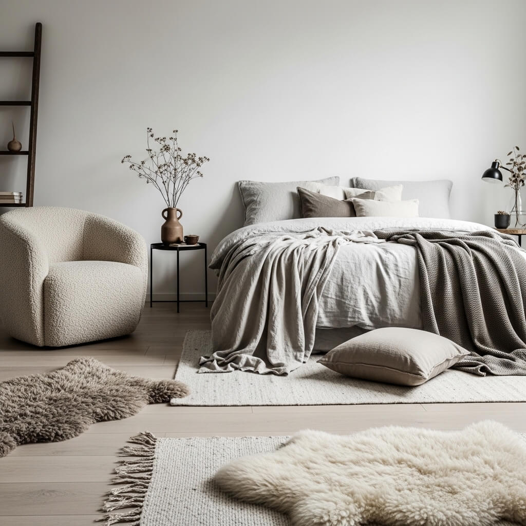 Think nubby bouclé accent chairs, heavy washed-linen duvet covers, raw silk throw pillows, and soft sheepskin or thick wool rugs layered over the light wood floors.