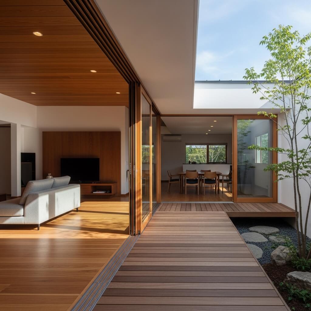 When opened, the living room flows seamlessly onto a wooden deck or a minimalist courtyard garden.
