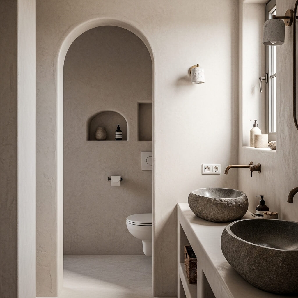 Complement these walls with raw, unglazed ceramics and organically shaped stone sinks.