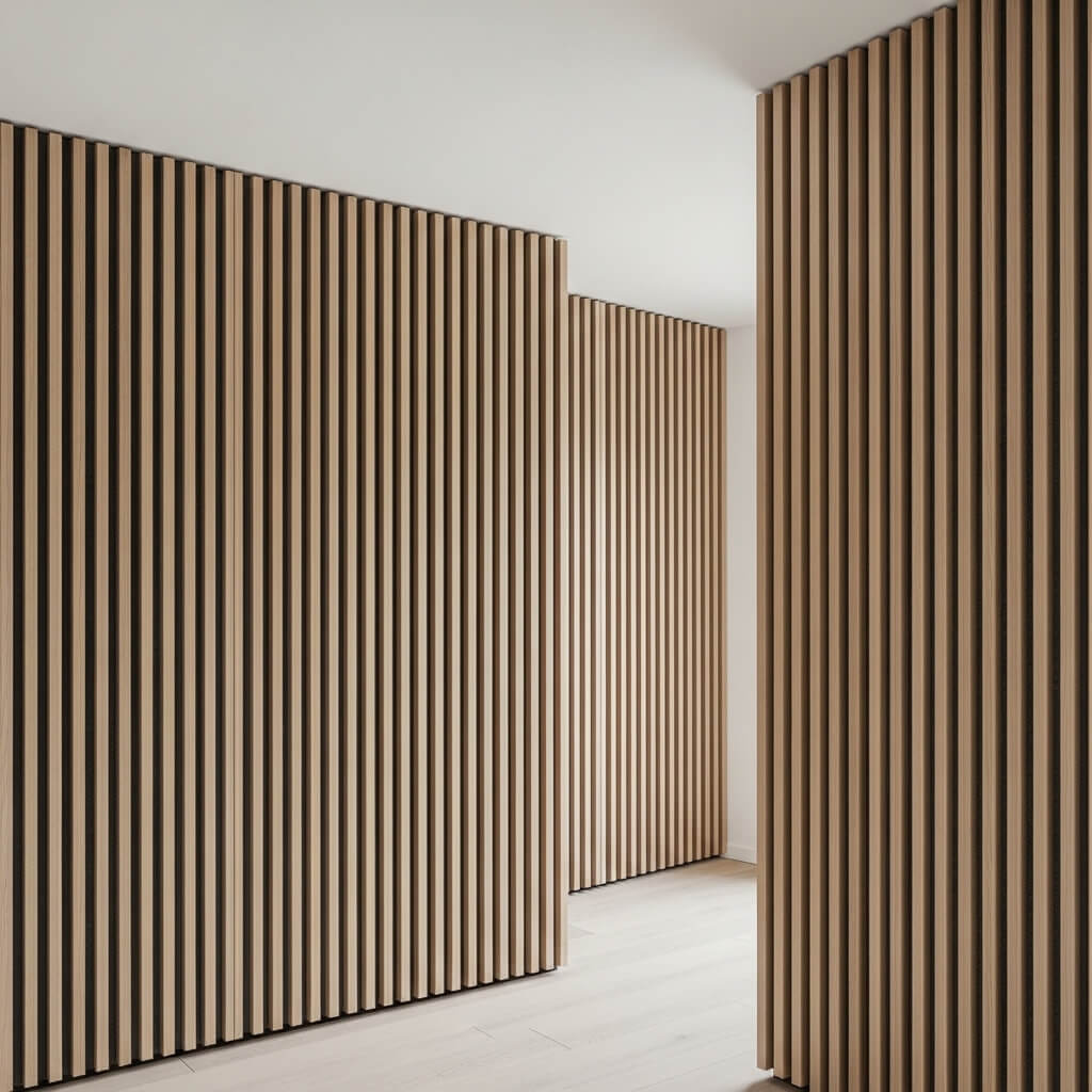 Installed as wall paneling or room dividers, these slats create a rhythmic, linear texture that draws the eye upward, making ceilings appear higher.