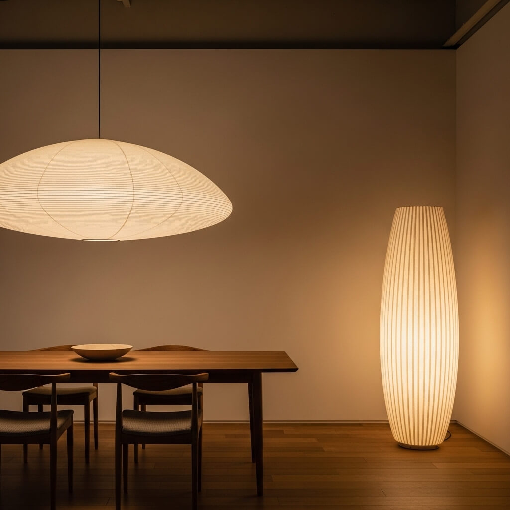 Architectural lighting often features oversized paper lanterns inspired by the iconic designs of Isamu Noguchi.