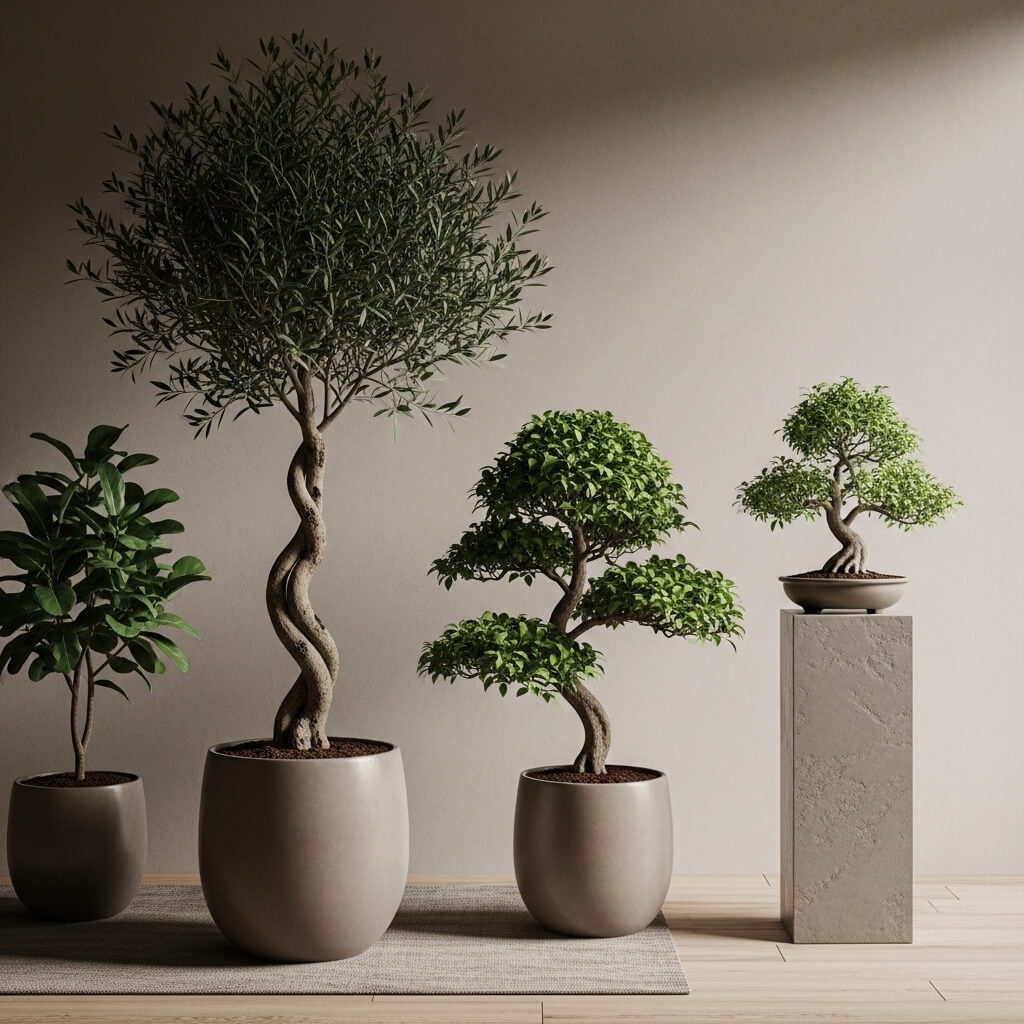 A large, twisting Olive tree, an indoor Ficus Audrey, or a carefully cultivated Bonsai placed on a pedestal acts as a living piece of art.