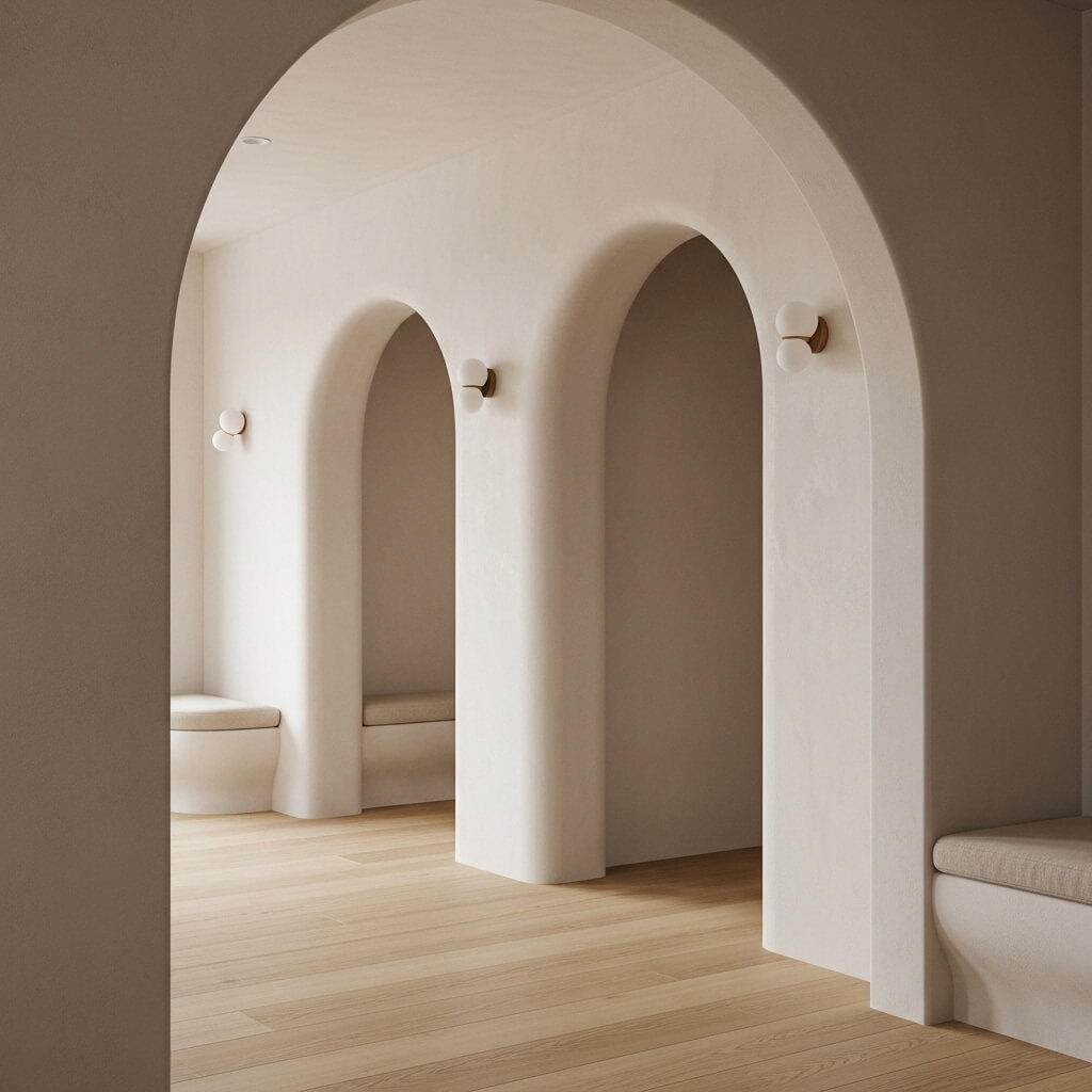 Incorporating arched doorways, curved transition walls, or rounded alcoves breaks up the harsh geometry of a modern build.