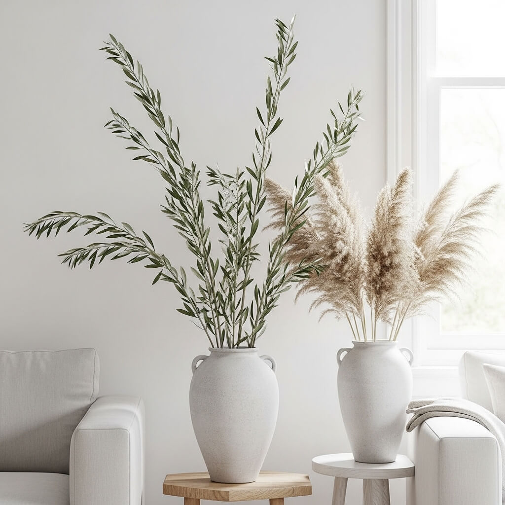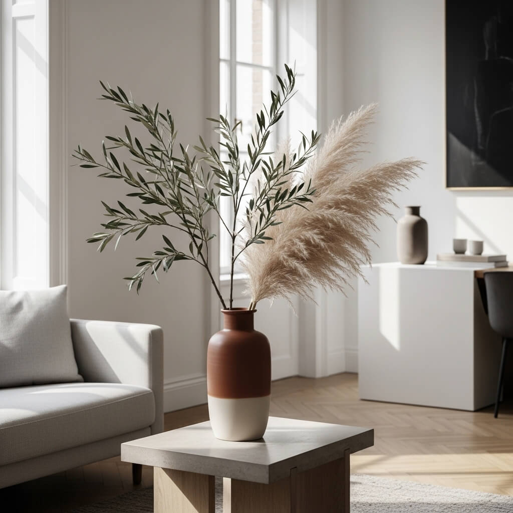 • The Display: Use a large ceramic vase with tall branches, like dried olive or pampas grass. This adds height and texture without maintenance.
