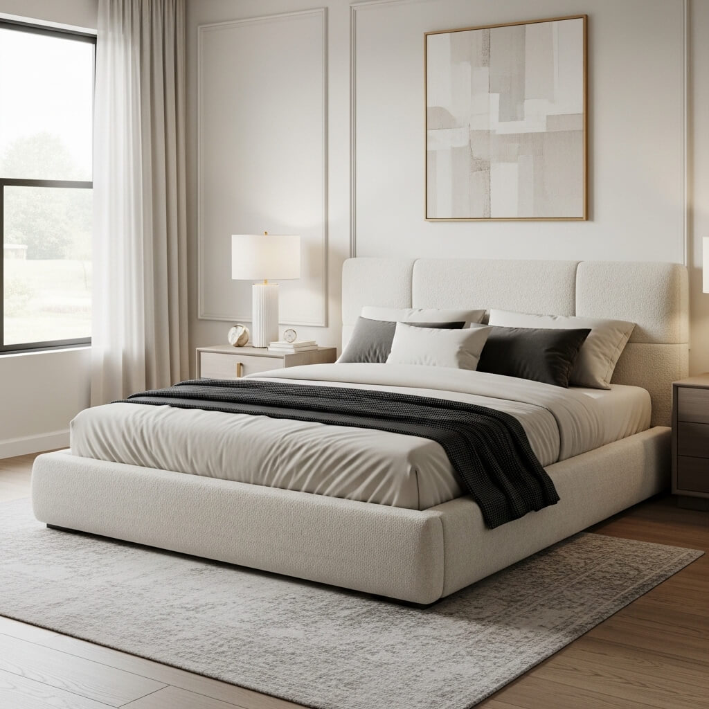 • The Luxury Factor: Go for an upholstered base and headboard in high-end fabrics like cream bouclé or brushed velvet. This softens sharp lines and adds comfort.