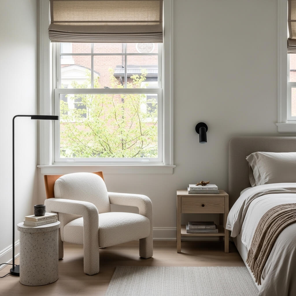 • The Furniture: If space allows, add a sculptural lounge chair near a window. A bouclé armchair or leather sling chair works well.