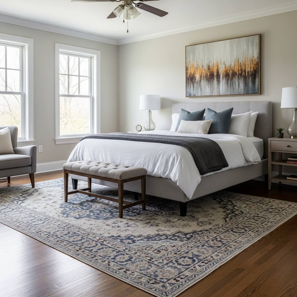 • The Placement: The rug should extend at least three feet beyond the bed. This anchors the furniture and adds warmth.