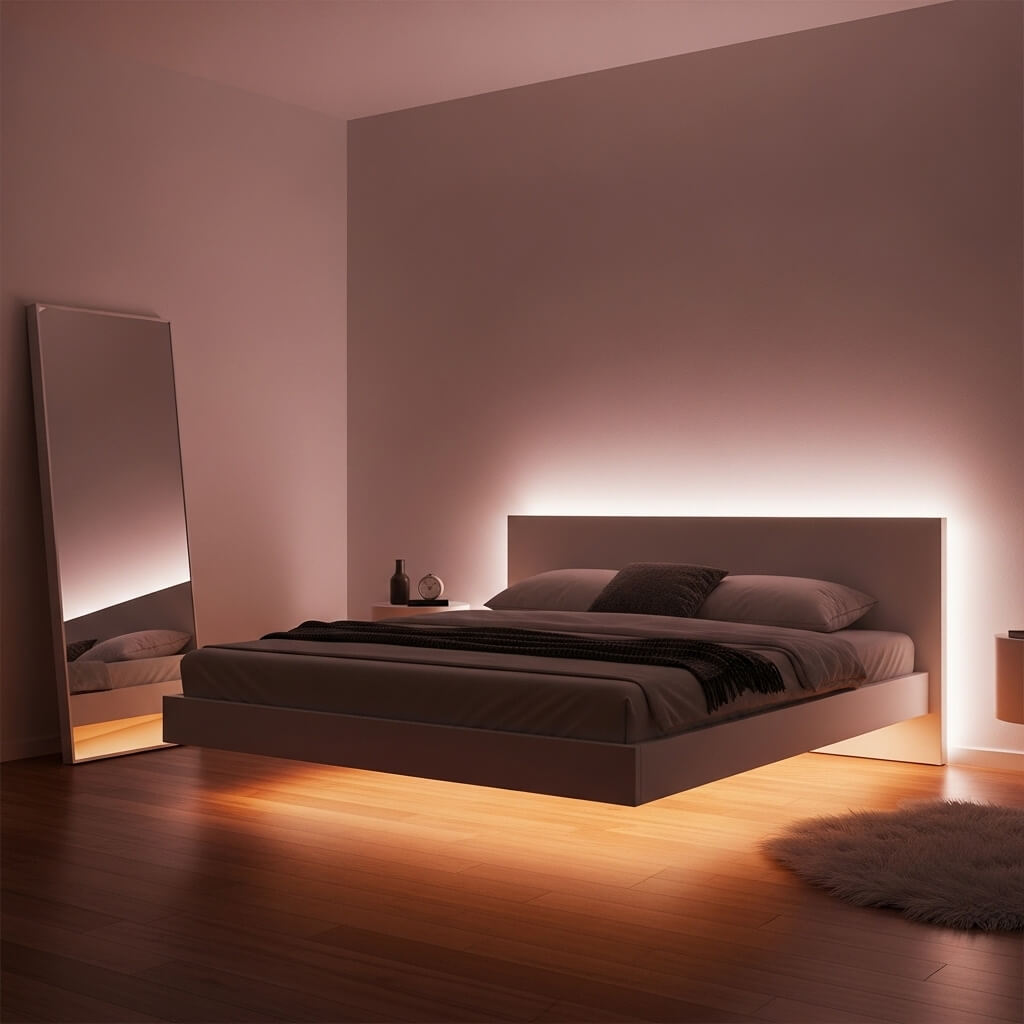 - The Concept: Stick adhesive LED light strips behind the headboard, under the bed frame, or behind a large mirror.