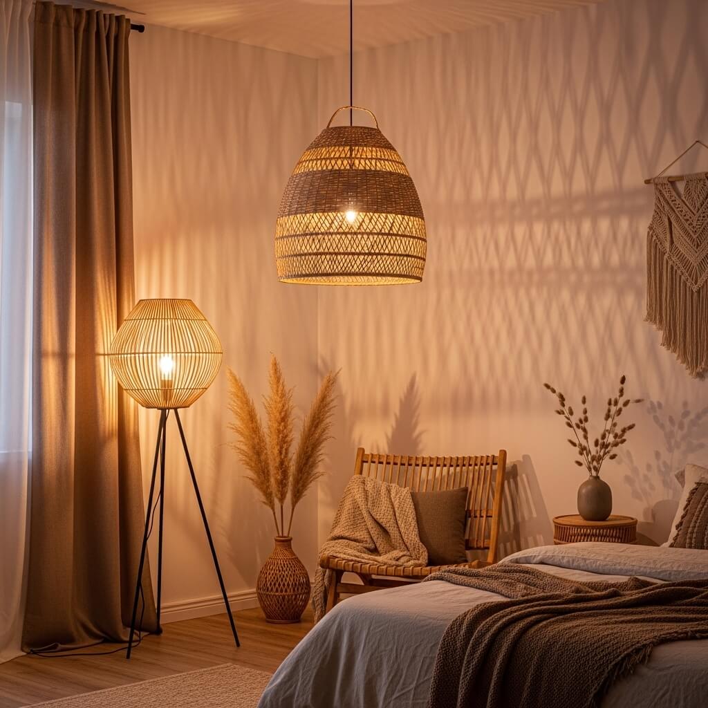 - How to Style It: Hang a large rattan pendant in a bedroom corner over a cozy reading chair. Place a tall bamboo floor lamp by the window. Combine these with linen bedding, neutral tones, and dried pampas grass for a trendy Boho-chic look.