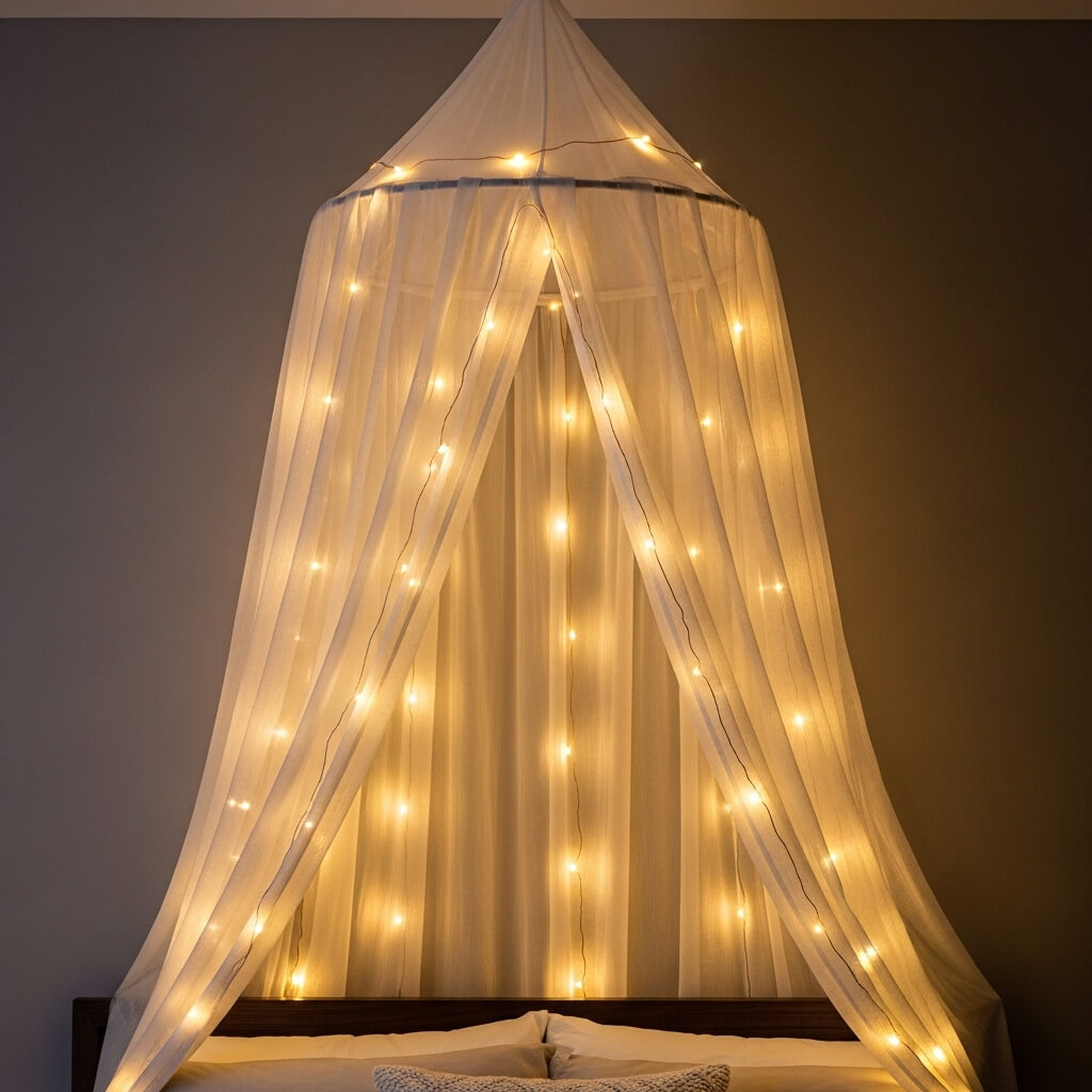 - How to Style It: Choose warm-white LEDs (around 2700K), not cool-white. Drape the fabric from a central hoop or attach it to four ceiling hooks for a four-poster look. Hide battery packs or plug-ins behind the headboard for a clean, polished finish.