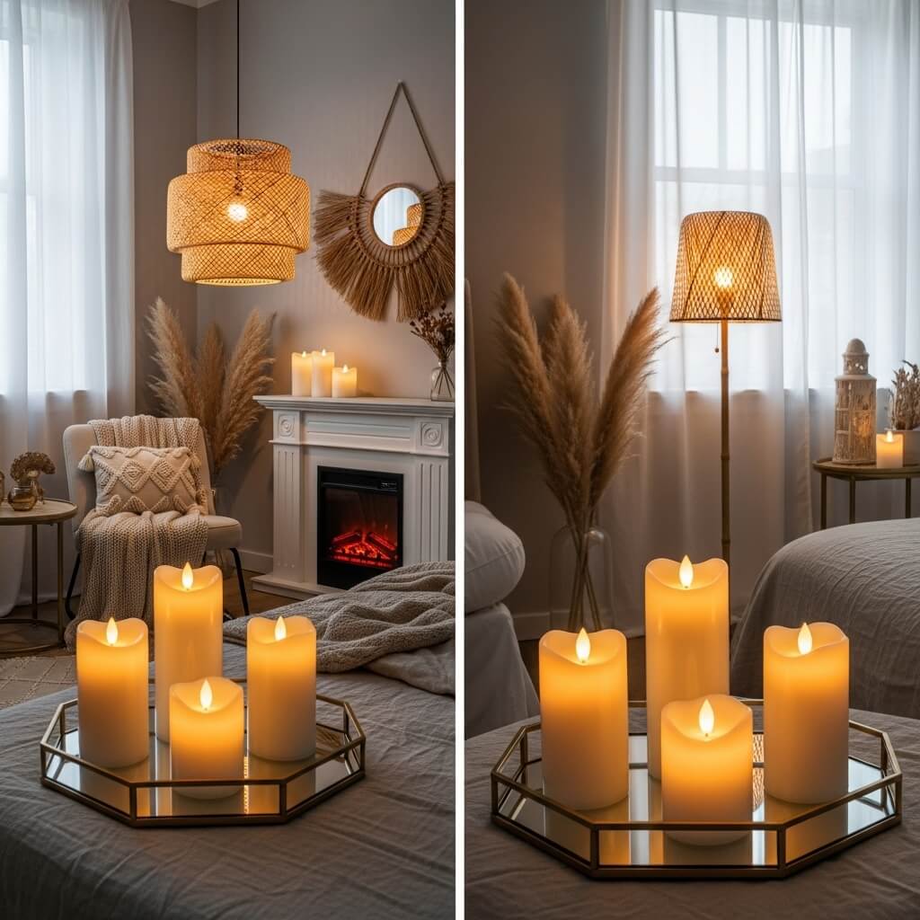 - How to Style It: Choose LED candles in different heights (like 4, 6, and 8 inches). Arrange them in clusters of three or five on a mirrored tray on your dresser. You can also place them in a large, empty decorative fireplace mantel for a grand, romantic look.