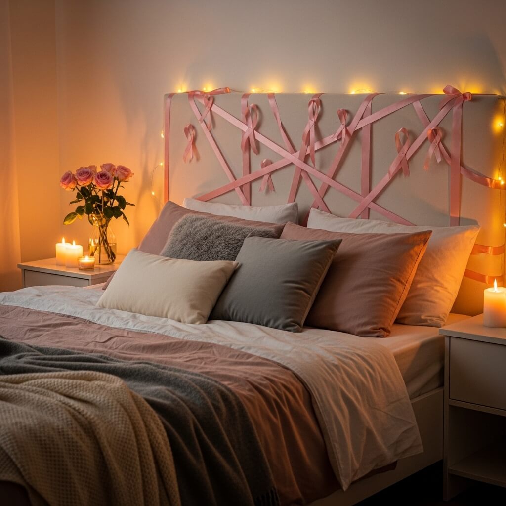 • Weave soft pink ribbons through your wooden headboard.