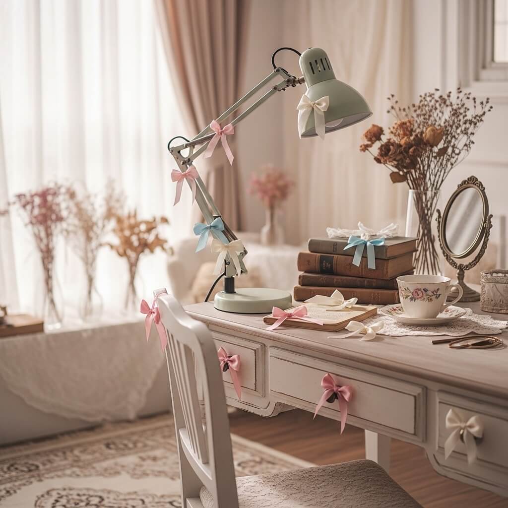 I tie tiny satin bows onto my desk lamp and drawer pulls.