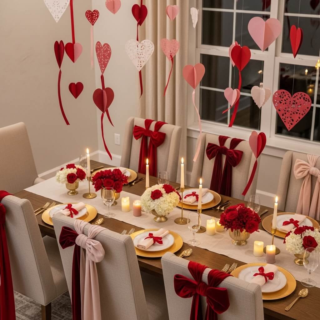 I drape velvet ribbons over my dining chairs and hang handmade paper hearts from the ceiling.