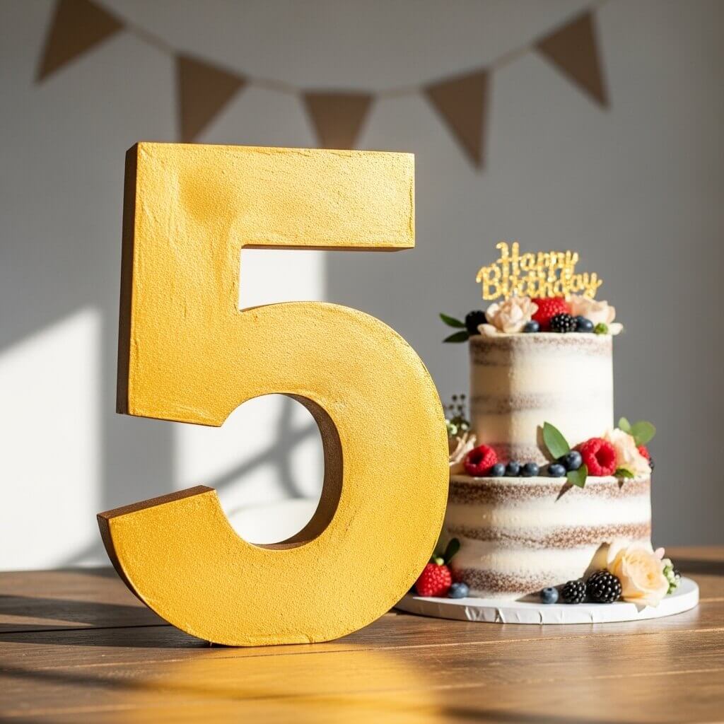 I cut giant numbers out of old shipping boxes and spray paint them gold.