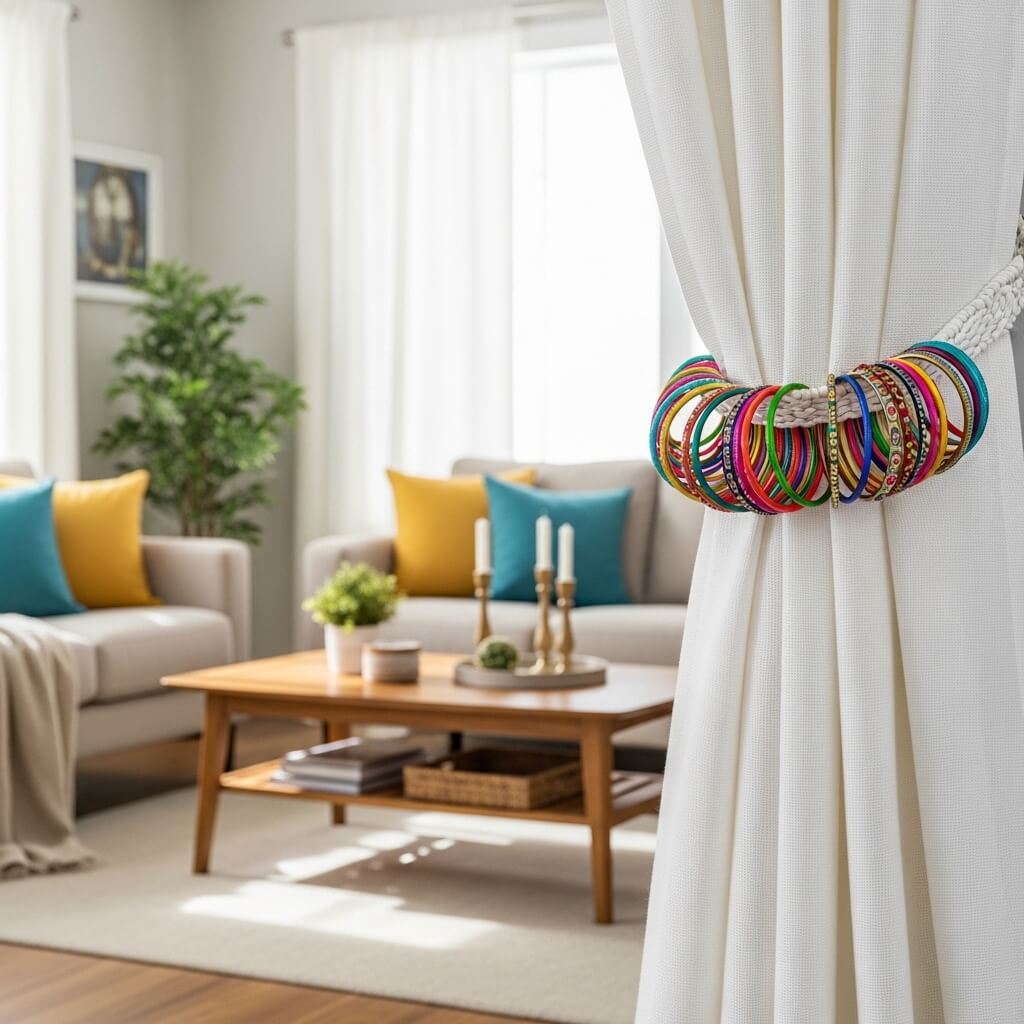 I slide bright bangles over my boring white curtain tie-backs.