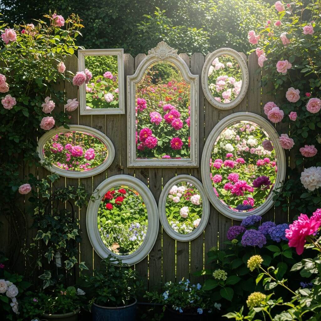 I hang old, framed mirrors on my fence to reflect the blooming flowers.
