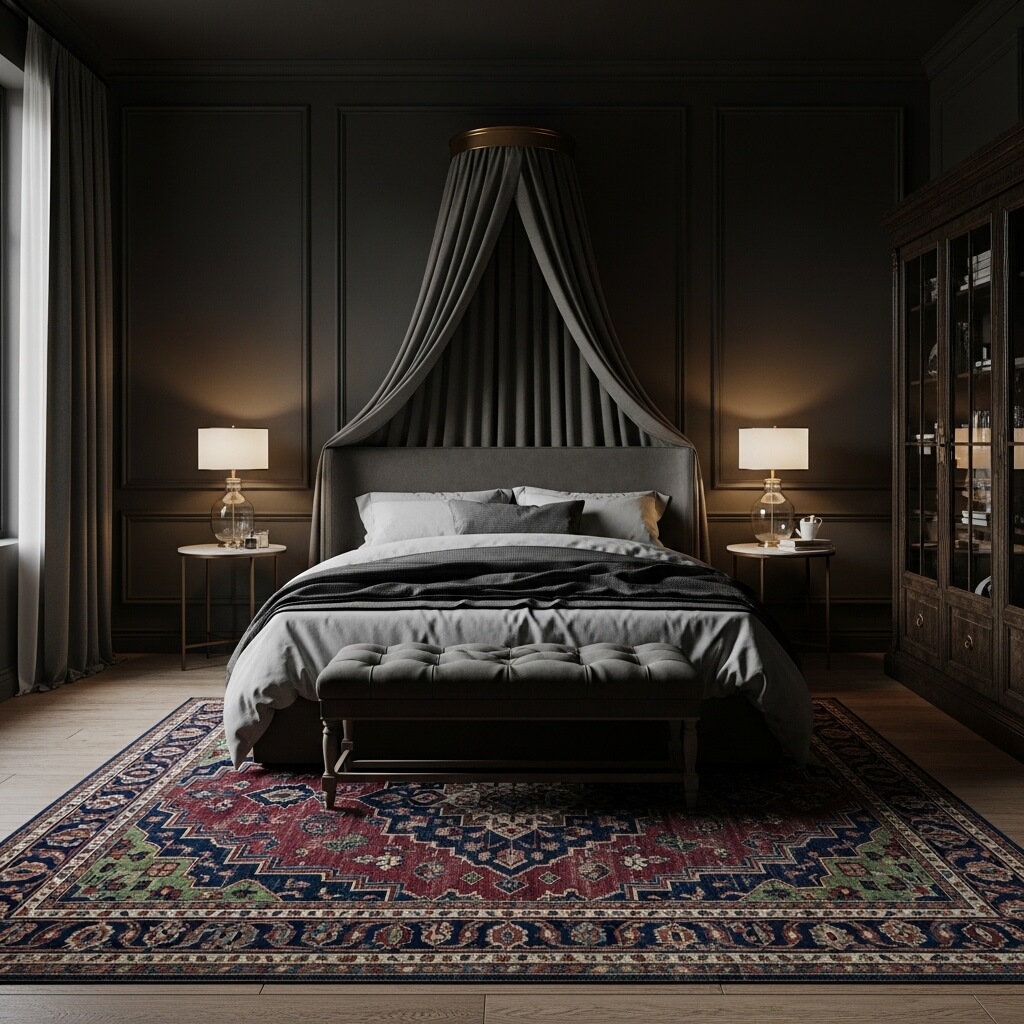 • The Rug Choice: Place a vintage Persian or Turkish rug under the canopy bed.