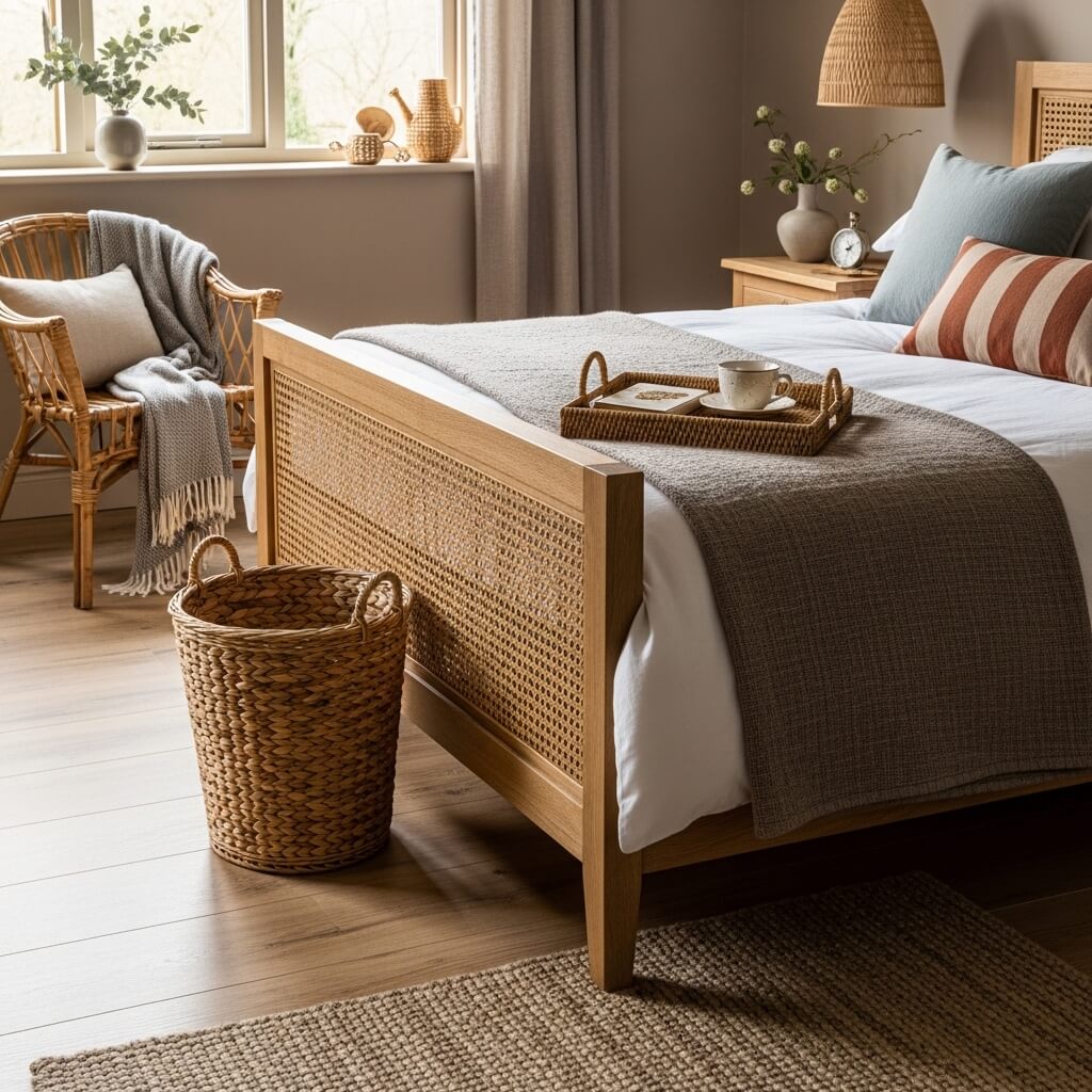 • The Balance: Woven fibers are key to earthy design. They bring a relaxed element, ensuring the heavy bed feels cozy, not cramped.