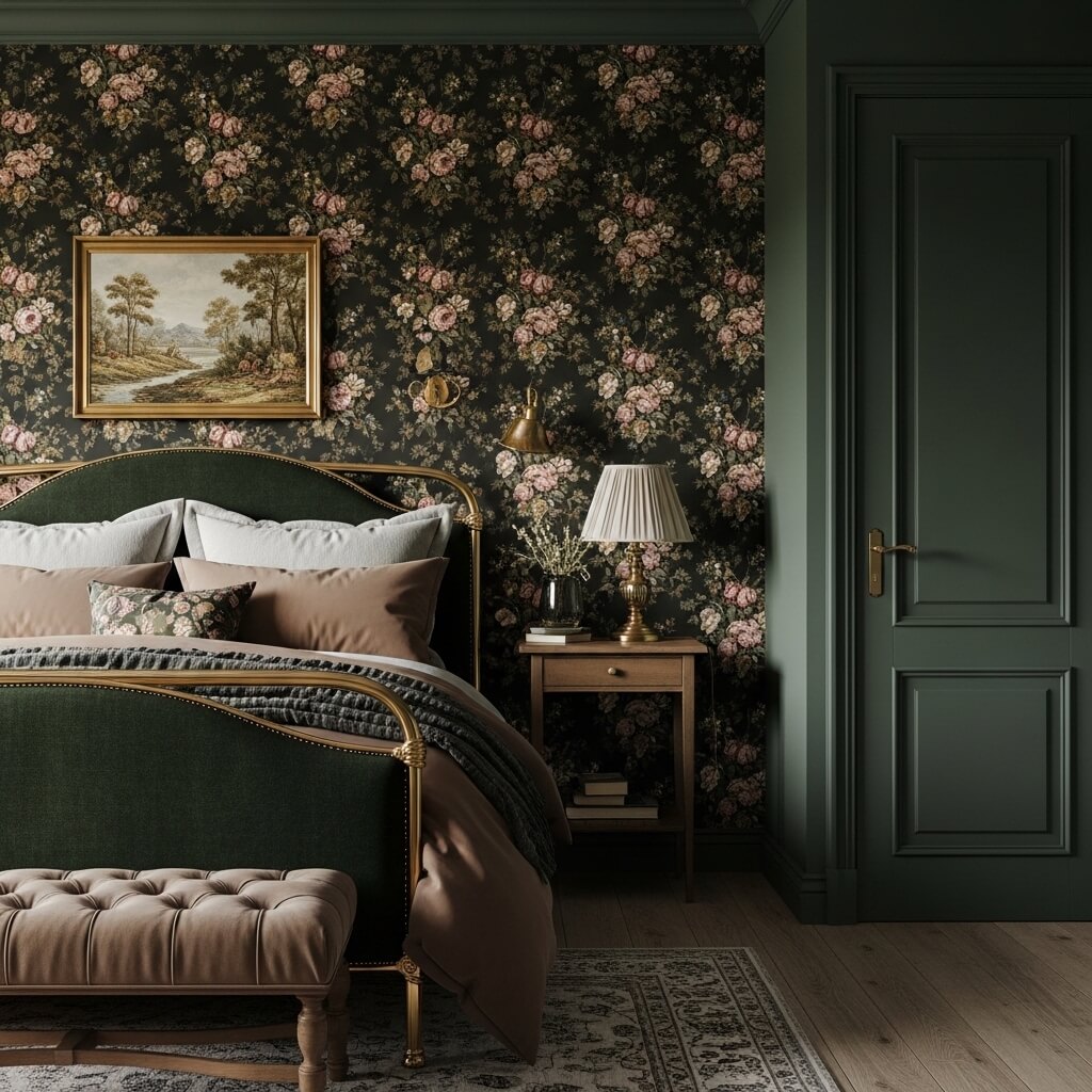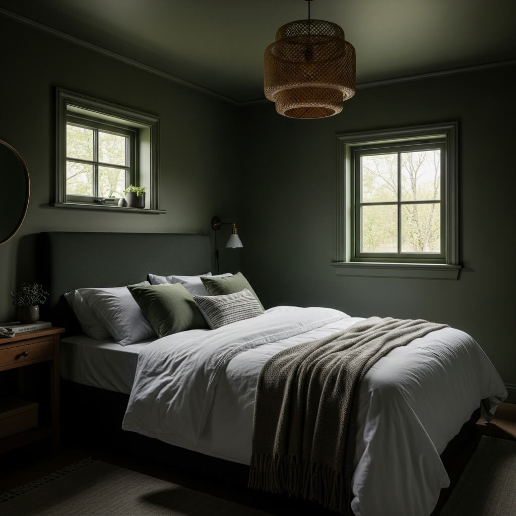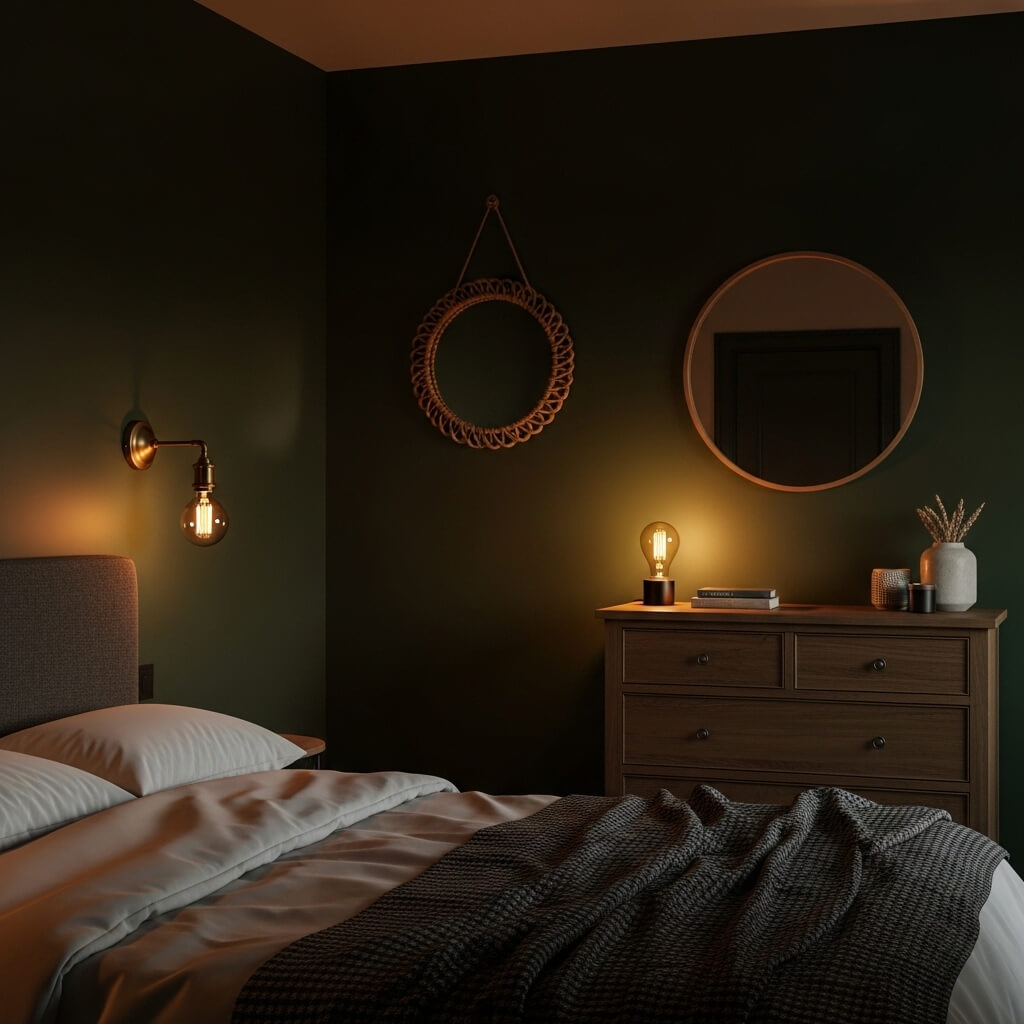 • The Fixtures: Install aged brass sconces by the bed and a small table lamp on a dresser. Use warm amber LED bulbs to make the dark green walls glow beautifully.