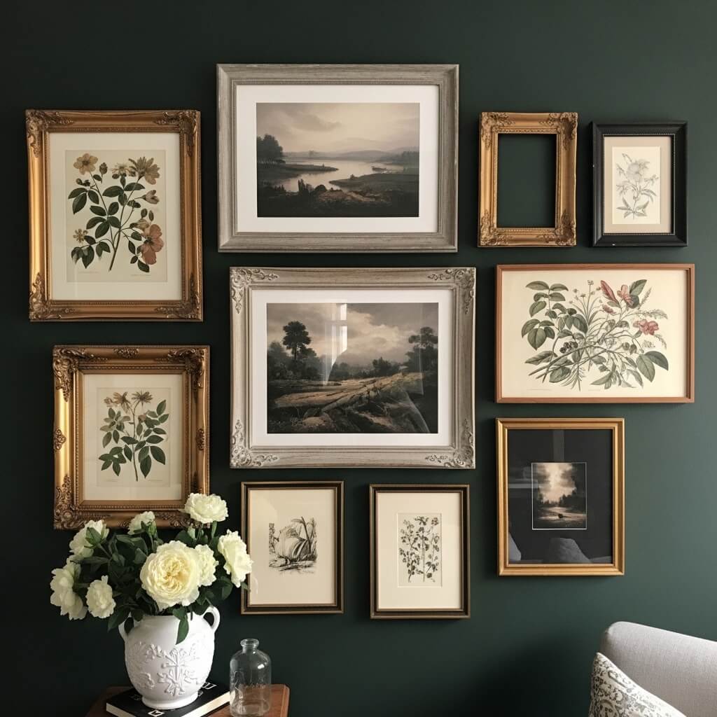 • The Layout: Hang art close together to form a single visual piece. The frames will pop against the dark green, adding character.
