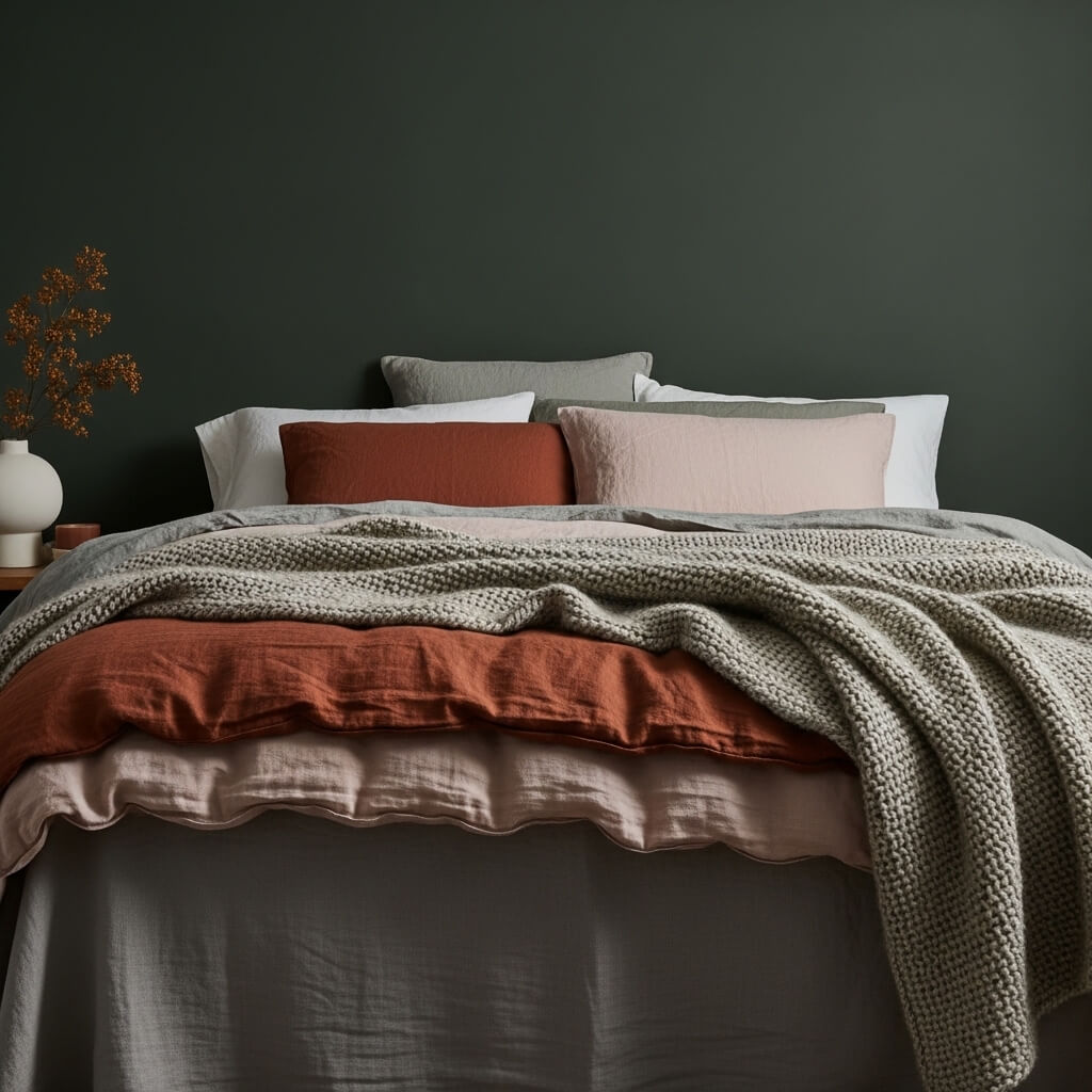 • The Bedding Palette: Avoid stark whites. Use “muddy” neutrals like clay pink, rust, or faded sage.