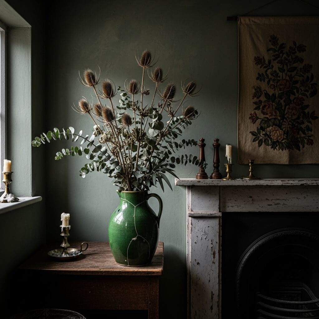 • The Curation: Use dried botanicals instead of live plants. A vintage jug with dried thistle or eucalyptus adds striking beauty.