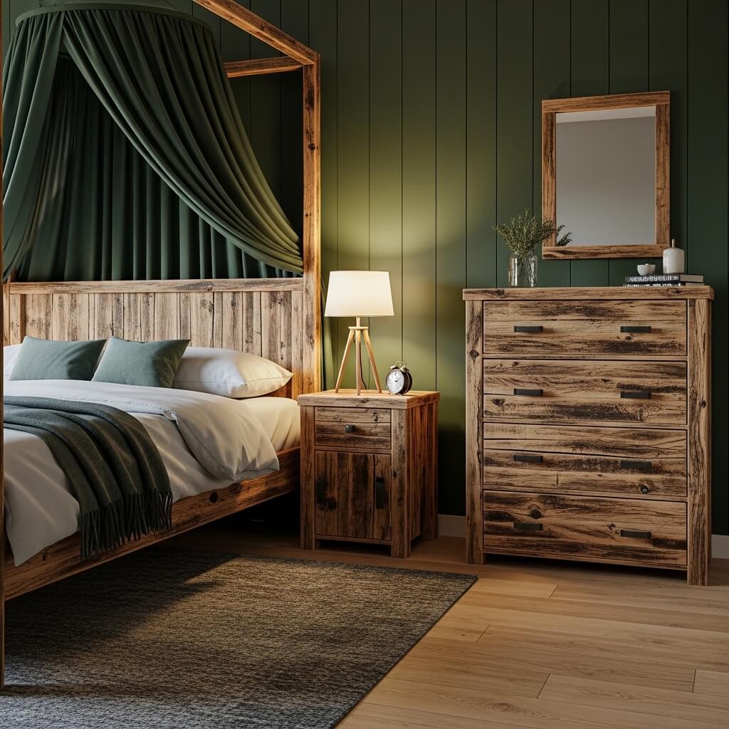 • The Impact: The warm wood grain breaks up the dark green walls, adding a rugged, authentic touch that balances the canopy bed.