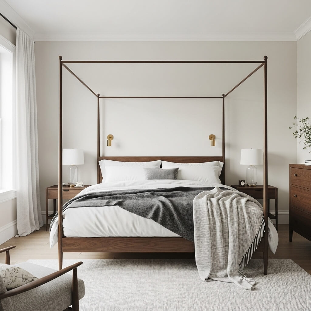 • The Frame: For a small room, avoid heavy frames. Choose a sleek, thin wrought-iron frame or a minimalist pencil-post wooden frame in dark walnut.