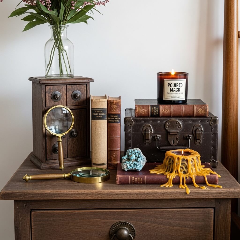 - The Styling: Style the surface intentionally with functional antiques: a tarnished brass magnifying glass, a stack of vintage, cloth-bound books, a small piece of raw amethyst or turquoise, and a heavy, poured wax candle. It turns a simple table into a storytelling vignette.