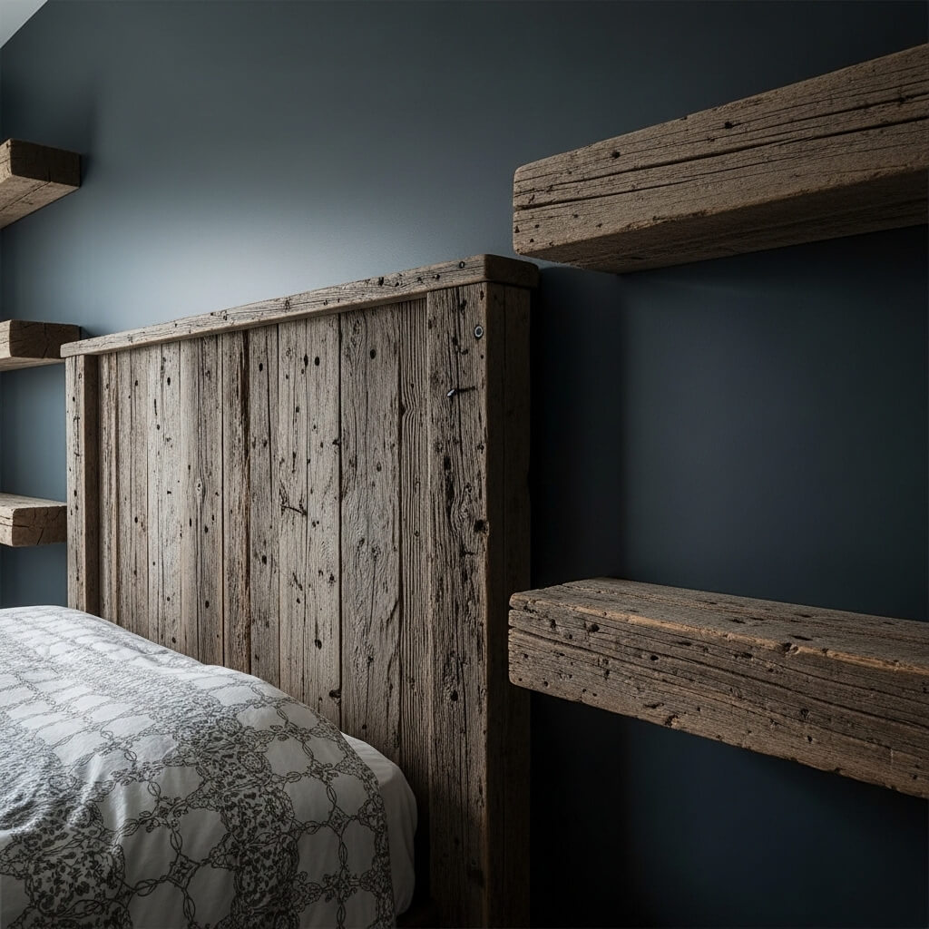 - The Application: Install a custom headboard made of rough-sawn, reclaimed barn wood. Alternatively, use thick, raw timber beams to create floating shelves.