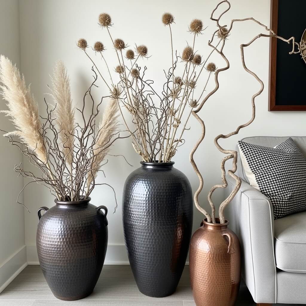 - The Curation: Decorate with oversized, dark ceramic or hammered copper floor vases filled with tall, natural dried pampas grass, tumbleweeds, dried thistle, or twisted manzanita branches.
