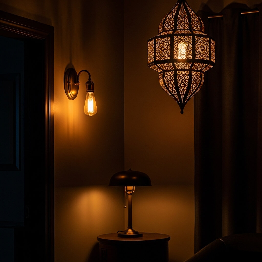 - The Fixtures: Opt for antique brass wall sconces, heavy iron table lamps, or a vintage Moroccan pierced-metal pendant light that casts intricate shadows across the dark walls.