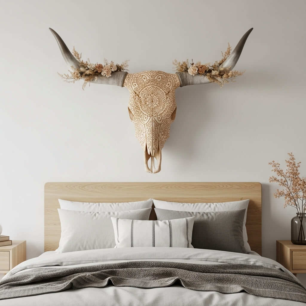 - The Boho Twist: To keep it from looking like a traditional hunting lodge, adorn the horns with dried floral crowns, or choose a skull that has been intricately carved with bohemian mandala patterns. It is an edgy, high-impact piece of art that anchors the room’s theme.