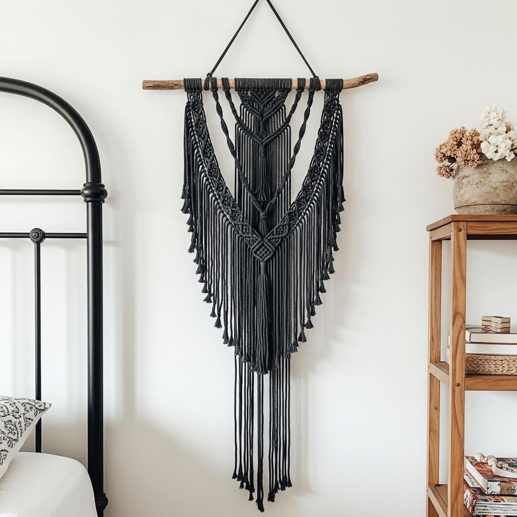 - The Softening: Suspend a large, intricate, dark-dyed macramé wall hanging directly from the iron.