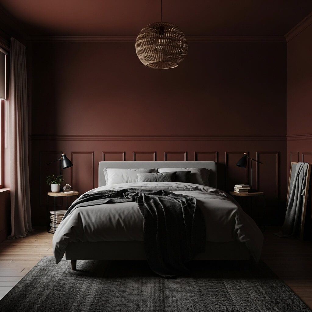 - The Cozy Impact: By eliminating the stark contrast of white trim, the boundaries of the room visually melt away. This technique mimics the feeling of sitting in a canyon under a night sky. It immediately turns a standard bedroom into a protective, incredibly restful cave that performs exceptionally well in aesthetic photography.