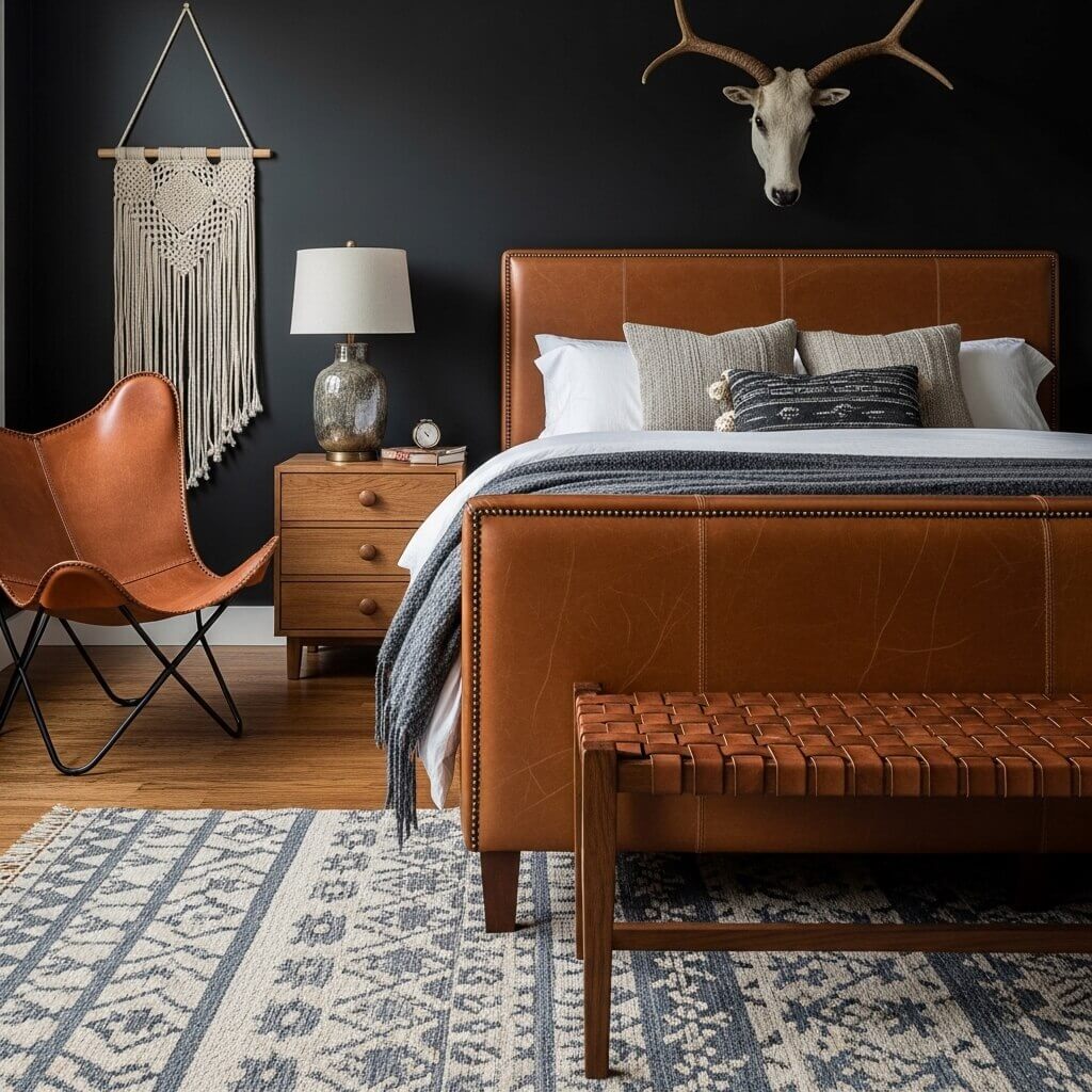 - The Integration: You don’t need an entire leather bed frame, which can look heavy. Instead, introduce a vintage, deeply distressed leather butterfly chair in the corner, a woven leather bench at the foot of the bed, or even heavy leather drawer pulls on your nightstands.