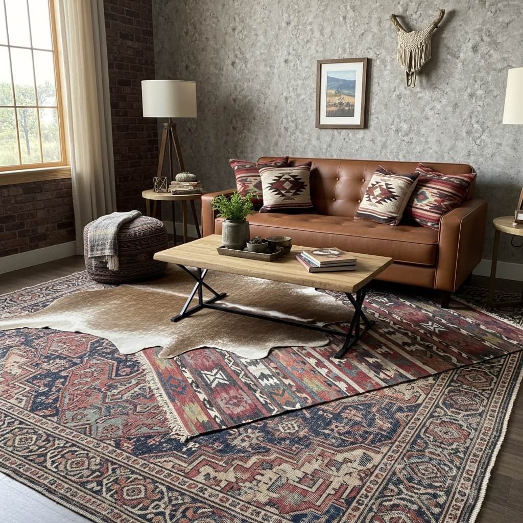- The Western Layer: Angled over the base rug, lay down a faux cowhide or a smaller Southwestern-patterned wool rug.